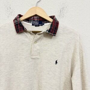 Vintage POLO RALPH LAUREN L/S Pony Polo Shirt w Plaid Collar USA MADE