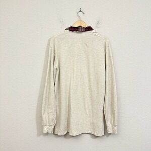 This is a stylish POLO RALPH LAUREN L/S Pony Polo Shirt w Plaid Collar in size XL. Made in the USA, it is crafted from 100% cotton with a light fabric wash for easy care, making it suitable for all seasons. The shirt features a collared neckline with a button closure and a classic fit. The long-sleeve design makes it ideal for winter, while the solid pattern and preppy theme are perfect for casual, travel, or christening occasions. The shirt is accentuated with a button and the brand logo. This vintage shirt is great for those who appreciate the 90s style and is sure to add an extra touch of style to any wardrobe.
