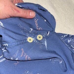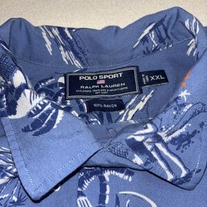 This is a vintage POLO SPORT Ralph Lauren button-down shirt in size 2XL. Made of lightweight rayon fabric with a tropical Hawaiian paradise pattern, short sleeves, and a collared neckline with a spread collar. It features a button closure, pockets, and has a retro look. Perfect for travel, parties, or casual wear.