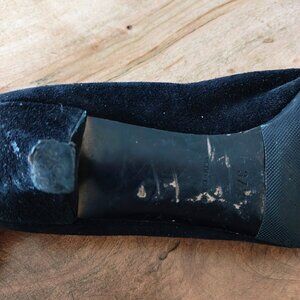 Prada black suede kitten heel pumps with white contrast stitching. Features a square toe and a low heel. Vintage style from the 1990s and 2000s.