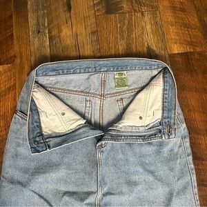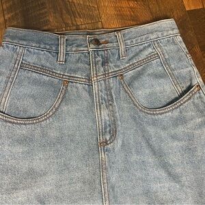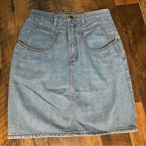 Great vintage PS Gitano light washed denim skirt size 10 petite short. Very flattering front with half rounded pockets. 14” across waist, 20” from waist to hem