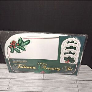 Vintage PVC Placemat Coaster Set Holly Berry Christmas Holiday Design 8 Pc Set. Packaging has wear from age and storage. See pictures. Sold as is.
