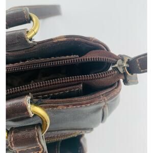 Elevate your style with this preowned vintage PVC purse, crafted with durability and character. Embracing a rich brown hue and adorned with brass-colored hardware, including zippers, it exudes timeless charm. Designed with practicality in mind, it features multiple pockets, including one tailored for a vintage flip phone. The adjustable strap offers versatility with a drop length of 12.5 inches. Measuring 10 inches in width, 9 inches in height, and 3.5 inches in depth, it provides ample space for your essentials. Lined with lightweight PVC fabric and boasting an exterior that mimics leather, this purse seamlessly blends fashion and function.
