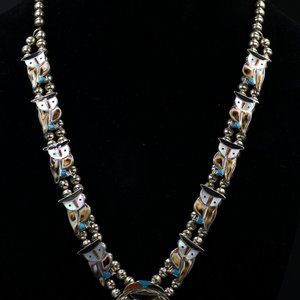 Vintage Signed PW Natewa Zuni Owl Inlay Squash Blossom. 24 inches in length. Multi Gem Stones. Turquoise, Red Coral, Black Onyx, Mother of Pearl, Oyster Shell.