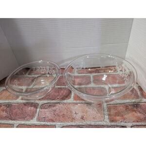 This set of 2 vintage PYREX Colonial Mist mixing bowls features a charming floral Colonial Mist daisy design on clear glass. Made in the United States, these nesting bowls are by the trusted brand, PYREX. With an impressed backstamp, this two-piece set is perfect for adding a touch of nostalgia and retro style to your kitchen or table setting. Ideal for everyday use or as a decorative display, these bowls are a timeless addition to any collection.