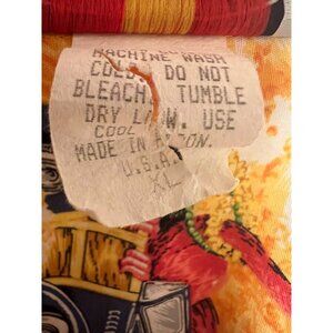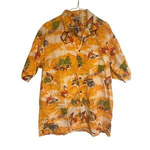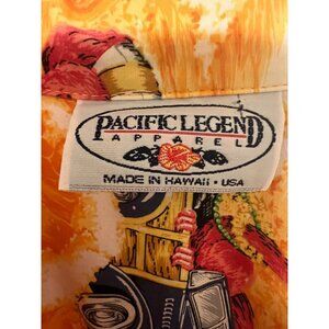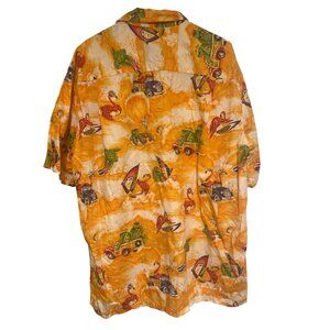 Men’s vintage Pacific Legend short sleeve aloha shirt, sized XL (approximately 24″ pit-to-pit, 31″ length). Bold novelty print featuring surf, flamingos, turtles, classic cars, and island themes on a vibrant orange and cream base. Made in Hawaii, USA. A standout collectible piece for vintage Hawaiian shirt and novelty print enthusiasts.