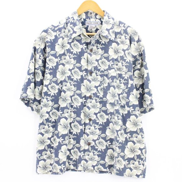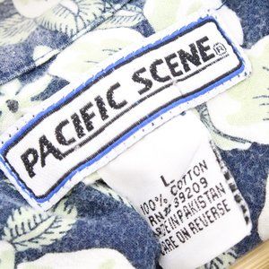 Vintage Pacific Scene Hawaiian Shirt Blue Button Down Short Sleeve Cotton Size L