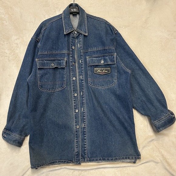 The Vintage Paco Jacket for men in size M features a classic mid-length design with a relaxed fit. Made of durable cotton denim in a solid blue color, this jacket is perfect for both casual and party occasions. The jacket is adorned with embroidered accents and branded with an emblematic button closure. With its oversized fit and pockets, this Y2K-inspired chore coat exudes a grunge, city, 90s, and hip hop theme, making it a stylish and versatile addition to any wardrobe for winter, fall, and spring seasons.