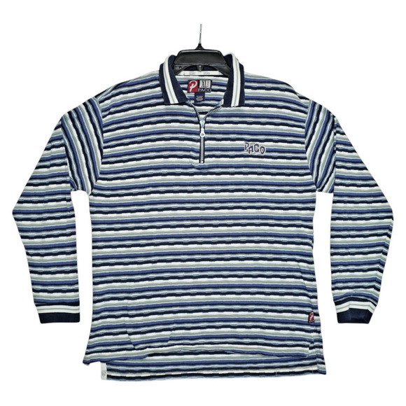 Step into retro vibes with this vintage Paco Jeans USA striped long sleeve polo in size XL. Features a bold navy, white, and sage green horizontal stripe pattern, ribbed cuffs, half-zip closure, and iconic Paco logo embroidery on the chest. Made from 100% cotton with branded inner collar detail. Made in India.