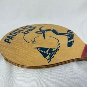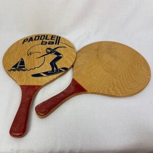 Keywords: paddle ball, beach paddles, wood paddles, vintage toy, retro game, beach game, paddleball set, surfer graphic, collectible toy, lawn game, outdoor game, vintage sports, beach decor