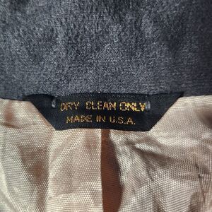 The materials tag is missing. Faded size tag appears to say 44R. Feels like 100% man-made material. Most likely polyester with a poly or acetate lining. Dry clean only.