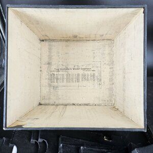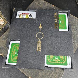 Features original wooden or composite case with black textured finish and splatter pattern on two sides. Lid fits securely. Interior of box features The Duplicate Whist Company patents dated 1893-1910. Each tray is numbered and marked "DEALER" with gold arrow, holding four sets of cards per tray (cards included in some trays for display).