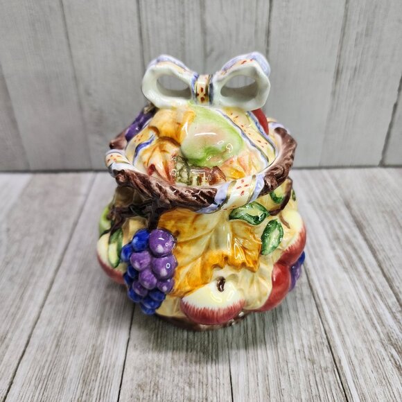 Vintage ceramic jam jar with a charming painted fruit and fall leaves design. Includes a matching lid. Perfect for adding a touch of nostalgia to any kitchen or collection.