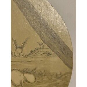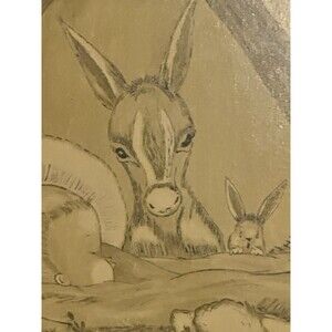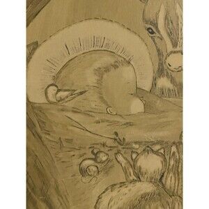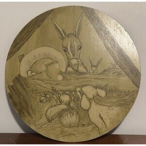 This vintage painted manger picture features a round wooden frame with a 15" diameter, depicting a scene of Baby Jesus surrounded by animals. The multicolor painting adds a festive touch, making it a perfect addition to a Nativity scene or Christmas decor. The unique design and vintage feel of this collectible piece make it a special and nostalgic display for any home during the holiday season. In great condition with some minor scratches. This will need something attached to the back to hang it.
