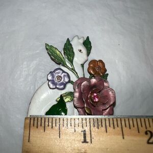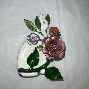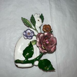Vintage Painted Metal and Rhinestone White Cat and Flower Pin