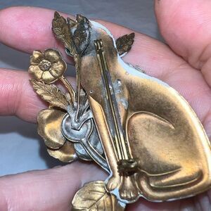 Vintage Painted Metal and Rhinestone White Cat and Flower Pin