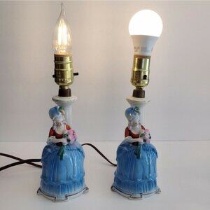 Vintage Pair Art Deco Sitzendorf German Porcelain Figurine Lamps Victorian Lady. These measure approx 9.5" tall. They both are in working condition. Someone tried to rewire one and didn't do a good job because the base where the light bulb sits is very wiggly. Will probably have to be rewired again and fixed. There also is some slight speckling on the ladies dresses which are shown in the pictures above. Otherwise in good condition with no chips or cracks. Comes from smoke free home.
