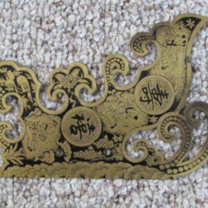 This is a beautiful and unique pair of matching, mirrored, gilt-over-black decorative metal fittings, inherited from my mother. They are very likely antique or vintage Chinese furniture hardware that would have originally adorned the front or sides of a cabinet, chest, or decorative plaque.
