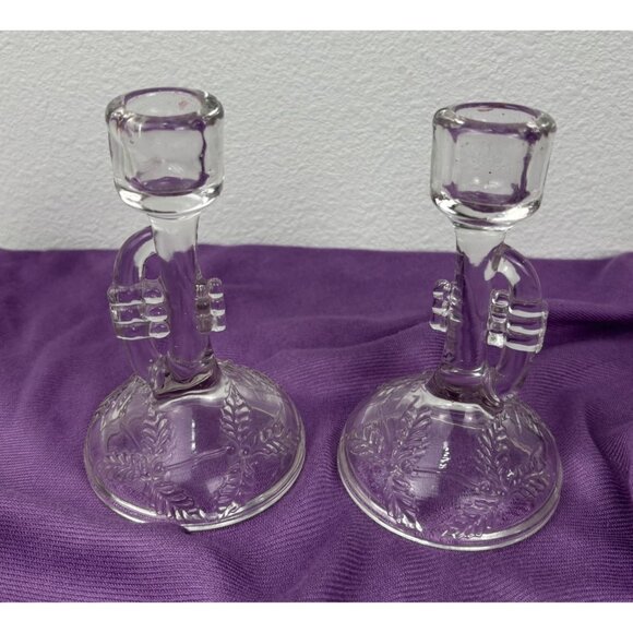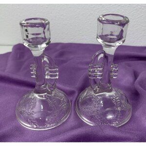 This pair of vintage glass candle holders features intricate floral etching and elegant curved handles. Their timeless design enhances any antique décor.