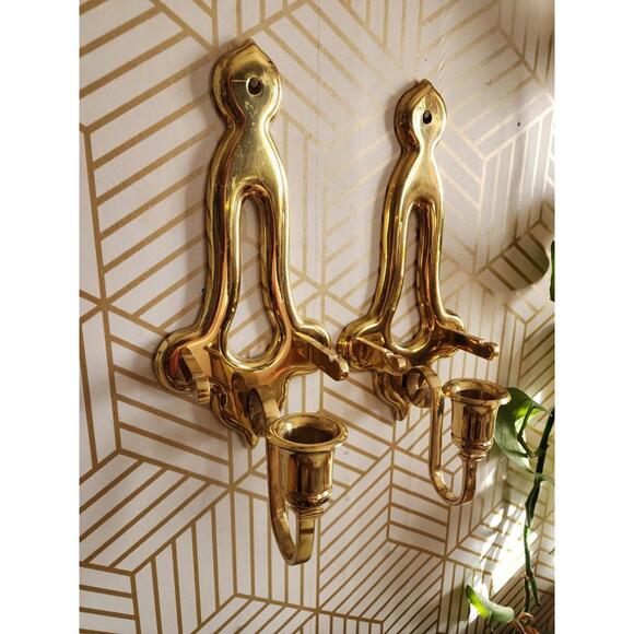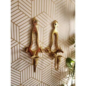 Vintage Pair Gold Brass Sconces Wall Hanging Candle Holder 11” With Plate Holder