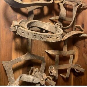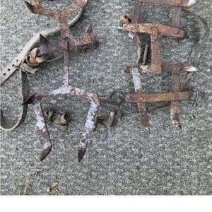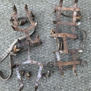 Introducing a vintage pair of crampons, complete with leather strapping for added durability. These military ice cleats are perfect for collectors especially for those interested in militaria. The leather is so very old and untouched in the straps, the buckles have certainly been used and show it. Please take a moment to view the photos to see not only the condition but to admire what our military endured for gear. These items have wear from use and age and they show it.