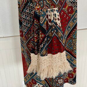 Vintage Multi Colored print mini dress with crocheted cotton fringe detail at arms. Long sleeved, elasticized neckline with beautiful crocheted fringe detail at arm openings. Made in Las Angeles, California. Measurements in photos. Preowned in very good condition, free of holes, tears or stains. You will definitely stand out in a crowd in this gorgeous Boho mini dress, perfect for festival, concert or going out. So cute with cowgirl boots, or wear with platform heels for a truly retro look!
