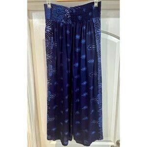 These Vintage Palazzo Wrap Pants are a one-size piece made of lightweight rayon material with a blue floral pattern. The pull-on closure and elastic waist provide a relaxed fit, perfect for travel, casual wear, or workwear during the warmer seasons of summer, fall, or spring. Handmade in Thailand, these ankle-length pants feature a wide-leg style and a high-rise waist, adding a touch of bohemian or hippie flair to any outfit. Ideal for beach days or relaxed occasions, these pants are a comfortable and stylish addition to any woman's wardrobe.