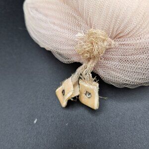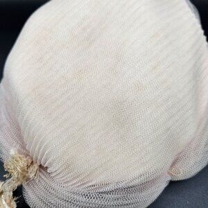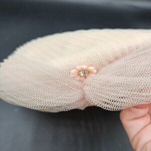 This vintage hair snood offers a delicate pale pink mesh design with velvet accents and subtle beaded embellishment. Ideal for elegant hairstyles.