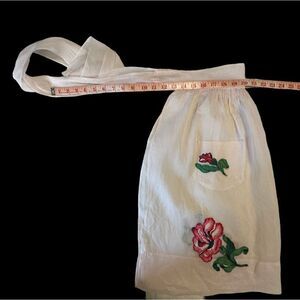 Vintage 1950s/60sz Pale Pink Sheer Cotton half apron embellished with sewn on floral patches has a little pocket on one hip.