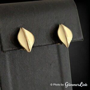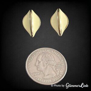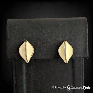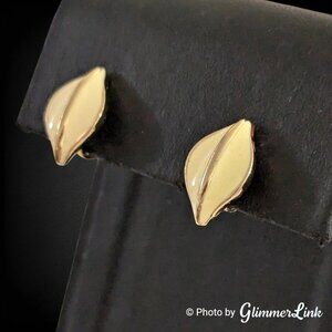 Vintage modernist earrings in gold tone metal with glossy enamel accents in a creamy pale yellow shade. The sculptural leaf-shaped design features a raised center ridge, giving them an elegant and minimalist look. Petite in size, they’re versatile for both everyday wear and dressier occasions.