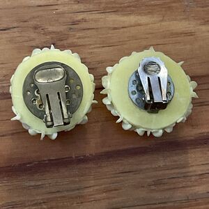 Vintage, round, dome shaped, pale yellow flower, clip-on earrings. Unbranded. The flower looks to be a dahlia or chrysanthemum. The- material is some type of plastic. I would date the earrings around 1950-1960. One clip has been replaced at some time since it is smaller than the other. Both clips are in good working order. Lightweight and comfortable to wear. In great pre-owned, vintage condition.
