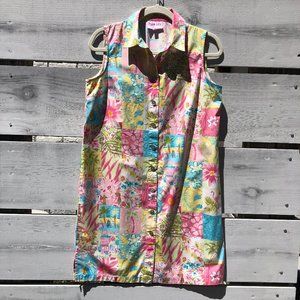 Vintage Palm Lily Cottagecore Sleeveless Boho Patchwork Button Front Shirt Dress