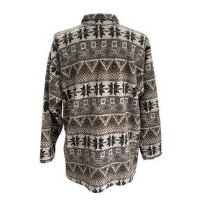 Stay warm and stylish in this Vintage Palmetto’s Sherpa Fleece Jacket in size Large. With its bold Southwestern / Aztec geometric pattern, this piece blends retro 90s style with unbeatable comfort.