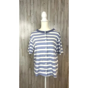 Men's blue striped button-up shirt in size L. Features short sleeves, a collared neckline, and a relaxed fit. Made from a blend of polyester and spandex, suitable for casual summer occasions. Machine washable. Pre-owned.