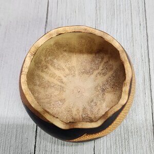 This vintage Panda Bear Gourd Shaker Trinket Coin Holder is 4" tall and hand-carved/painted. It's brown, made by an unknown brand, and embodies a unique vintage style.