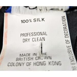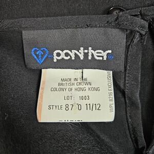 This vintage black long sleeve blouse is made of 100% silk and features flower embellishments on the front. The round neckline and button closure give it a classic secretary/geek style from the 1970s. The shirt is in a size M/L and is designed with a regular fit. With its original design and high-quality material, this Panther brand blouse is a stylish and unique addition to any vintage clothing collection.