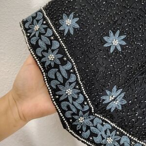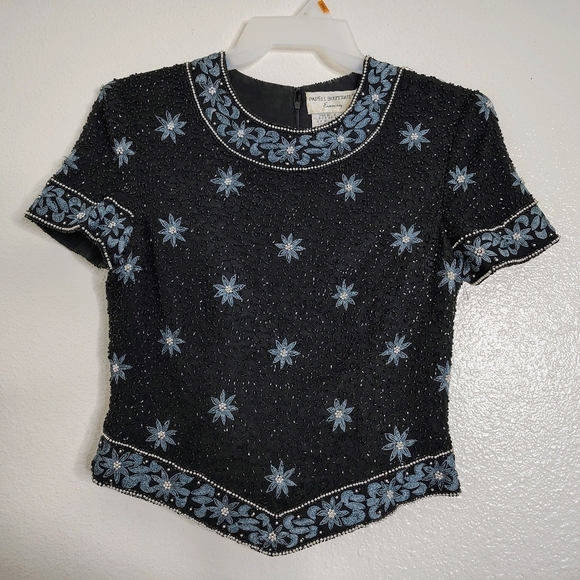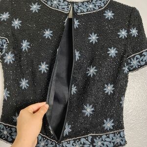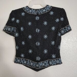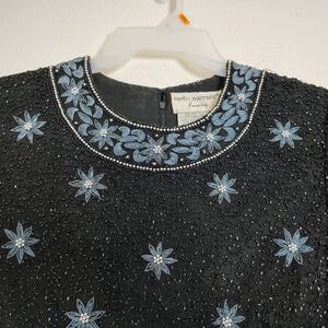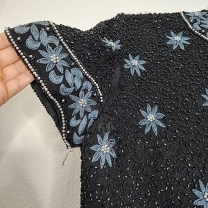 Vintage Papell Boutique Evening Top Womens Small Black Blue Floral Silk Beaded