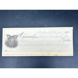 VVintage Paper Receipt fancy elaborate Design Elk (1893) Antique Receipt. This document is from “Hill & Drake Company, Pittsfield NH”. There is a sharp/clear illustration of an elk on it. It is in really good condition given its age. The paper has yellowed has no tears, and has some stains. There are no bad odors. The receipt was issued to Hill & Drake on February 22, 1893.