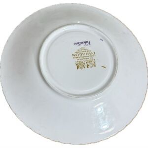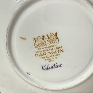 This vintage Paragon Bone China saucer features a beautiful "Valentine" pattern with clusters of purple flowers and gold trim.
