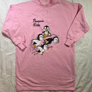 Vintage Parallele Nuit Penguin Kids Sleep Shirt, Made in Brazil, Size Small. Pink sweatshirt night shirt (or long shirt) with the phrase "Penguin Kids" in black script with three frolicking penguins cuttin' up on the front. Ribbed crew neckline and cuffs, finished hem at the bottom of the shirt.