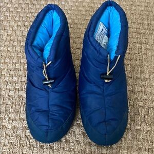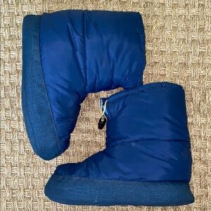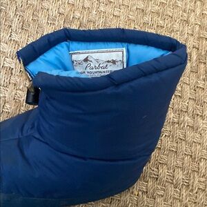 Parbat High Mountaineering boot/bootie/slipper by Parbat in Yuba City, Ca. Perfect for outdoor adventures. Nylon/Cotton/Polyester. Have some dirt but are Machine Washable. These are like a Moon Boot but more rustic. Drawstring pull closes top to keep cold/ice/snow out. Made in USA