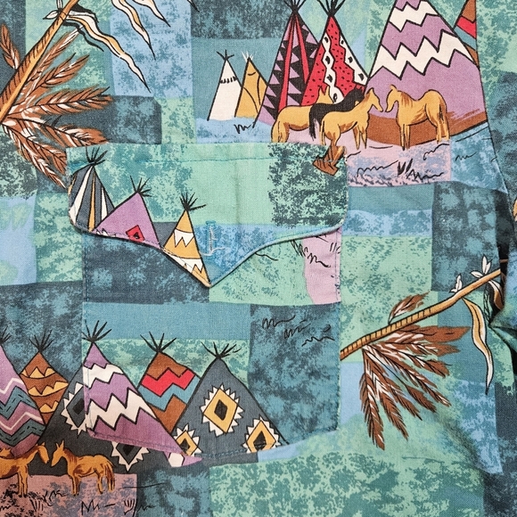 Make a statement with this rare vintage Parhandle Slim long sleeve western shirt, proudly made in the USA. Features a bold Southwestern patchwork design with teepees, horses, feathers, and prairie landscape elements throughout. Vibrant turquoise base with multicolor print. Double chest pockets, button front, and button cuffs. Material: 100% Cotton Made in USA Condition: Pre-owned, good vintage condition. Fabric and colors are strong. See photos for details. Perfect for rodeo wear, collectors, or anyone who wants that unique retro cowboy aesthetic.