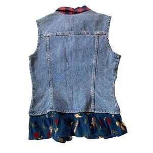 Vintage Paris Blues Denim Vest Plaid Collar & Floral Hem Large