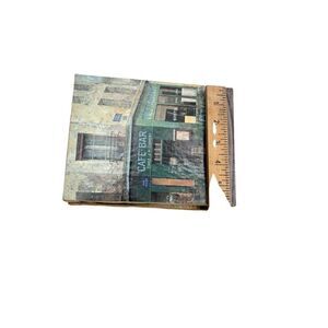 • Weathered dark blue, red, tan storefront scene.