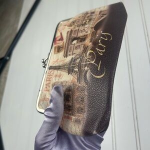 Elegant women's clutch featuring a Paris theme. The brown and cream design adds a touch of sophistication to any outfit.
