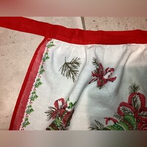 Vintage linen Christmas apron features red and green bells, bows and ornaments. Believed to be a Parisian Print product. Extremely good condition. Top of apron is 17.5” wide. Bottom of apron is 26.5” wide. Each belt tie is 22.5” long.
