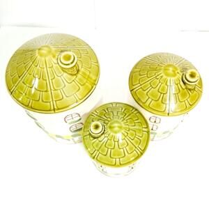 Vintage circa 40s 50s Sugar, Coffee and Tea 3 canister set figural Parisian cottages by Creative Imports NY. Made in Japan