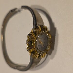 Vintage Park Lane Quartz Watch Goldtone Flower And Silvertone Hinged Band. Not tested