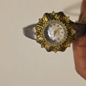 Vintage Park Lane Quartz Watch Goldtone Flower And Silvertone Hinged Band