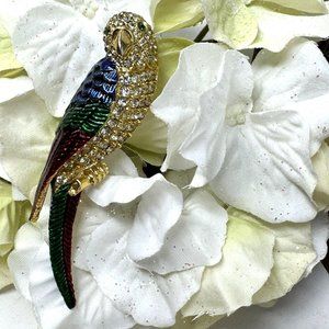 Vintage Parrot Brooch Pin Enamel N Rhinestone Goldtone